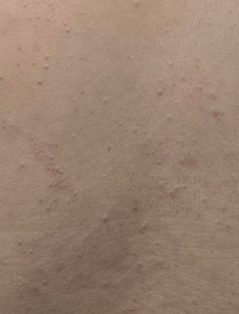 저번에 봤을 때 등 전체적으로 두드러기처럼 오돌도돌하게 올라왔습니다. 전엔 가려웠었는데 오늘은 가렵지 않고 따갑거나 통증은 전혀 없습니다.