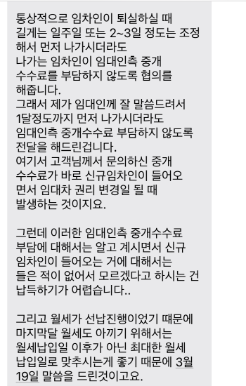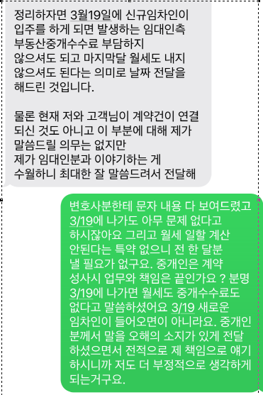 중개수수료라는 말 자체가 새로운임차인이 전제라고 주장하며 본인이 말했던 3/19 퇴실은