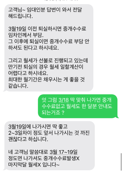 3/19 딱맞춰 퇴실하는게 제일 좋으며, 3/17~3/19에 퇴실시 중개수수료X 마지막달 월세 X