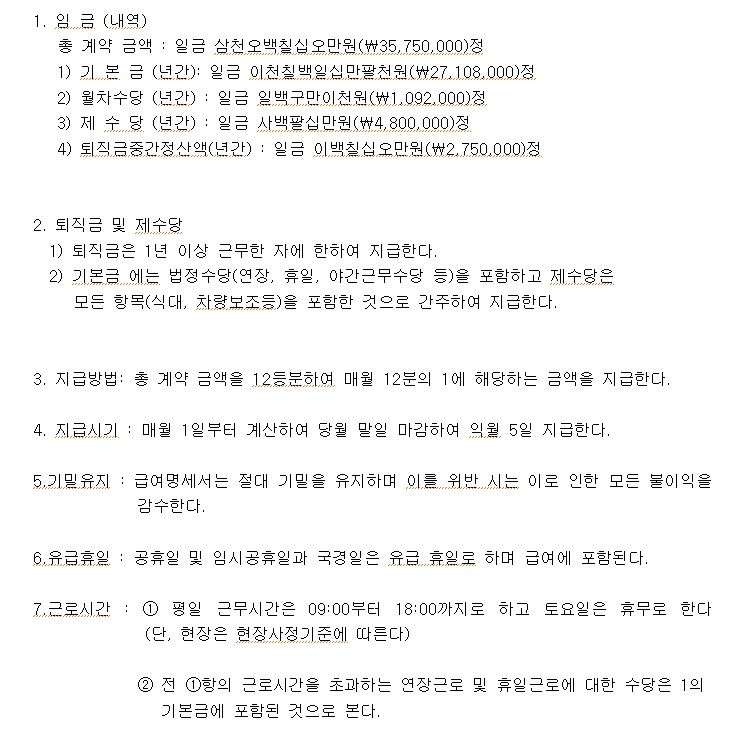 연차유급휴가 미사용시 회사는 수당으로 지급하여야 합니다. 이에 대하여 임금항목에 포함시켜 미리 지급하더라도 근로자의 연차휴가 사용을 제한 하지 않는 경우는 유효합니다. 계약서상 대략 12일 분에 대한 연차수당으로 보입니다. 연차사용치 차감 지급여부나 1년이상 근로시의 연차휴가 발생에 대한 부분은 회사에 확인하여야 합니다.