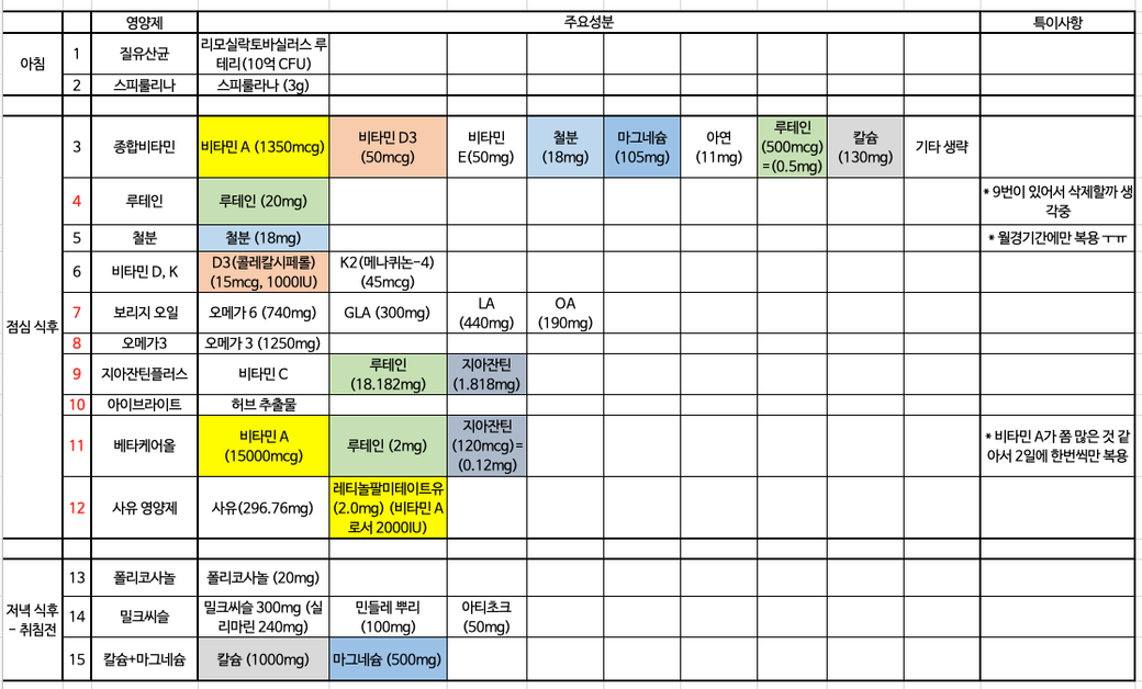 루테인, 사유, 비타민A중 사유 하나로 줄이시길바랍니다.
