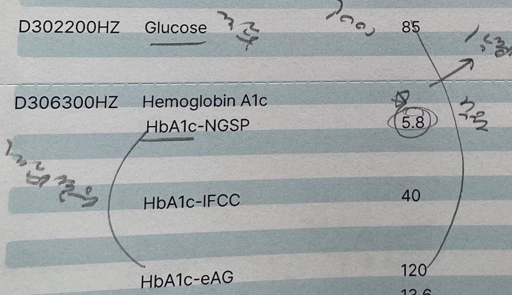 식사 후에 피검사한거라 공복혈당은 정확하지 않습니다.