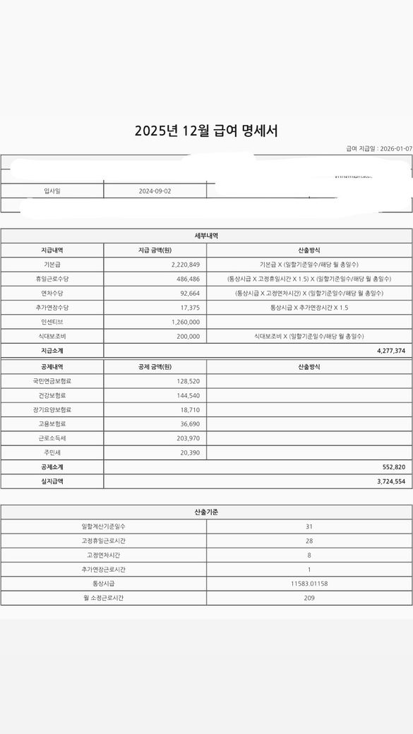 현재 피부과의원에 근무 중인 직원입니다. 저희 병원은 1년이 되면 연봉협상을 하는 게 아닌 1월과 6월로 정해두고 소급급여?로 주는 형태로 진행 중입니다. 24년 9월에 입사하여 26년 1월에 연봉협상을 하는 게 맞지만 바쁘다는 이유로 미뤄졌고 협상을 하지 못한 채 월급을 받았습니다. 받았는데 저는 협상하지도 않은 월급으로 올라가있었고 명세서를 받으니 기본금은 오히려 이전보다 낮아져있습니다. 그리고 없었던 연장수당이라는 게 생겼고 월 소정 근로시간도 이전과 다르게 적혀있었습니다. 여기서 제가 궁금한 건 제 동의 없이 월급을 올려서 준 것이 연봉협상을 했다고 할 수 있나요? 그리고 기본금은 왜 낮아진걸까요? 답변 부탁드립니다ㅠㅠ 병원측에 물어보긴 할건데 그 전에 저도 좀 알아두고 대화 나누고 싶어요ㅠㅠ 사진 첨부합니다! 12월에 나와있는 기본금은 이전에부터 계속 바뀌지 않던 부분입니다
