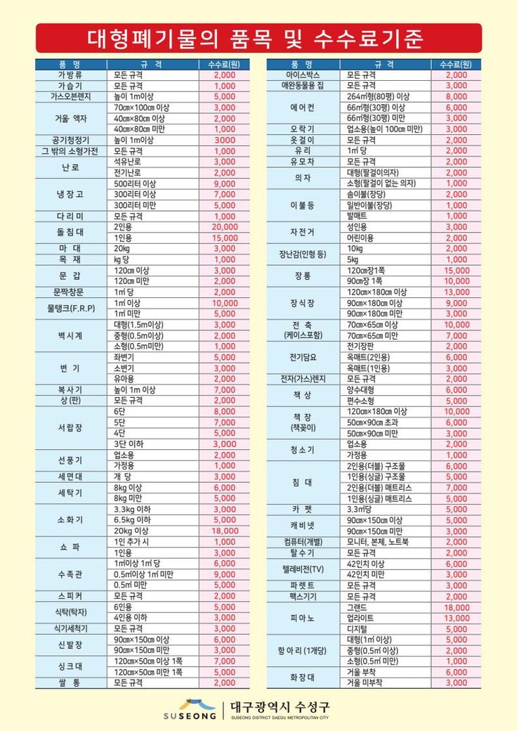 이게 제가 사는 구의 대형폐기물 처리 수수료인데요