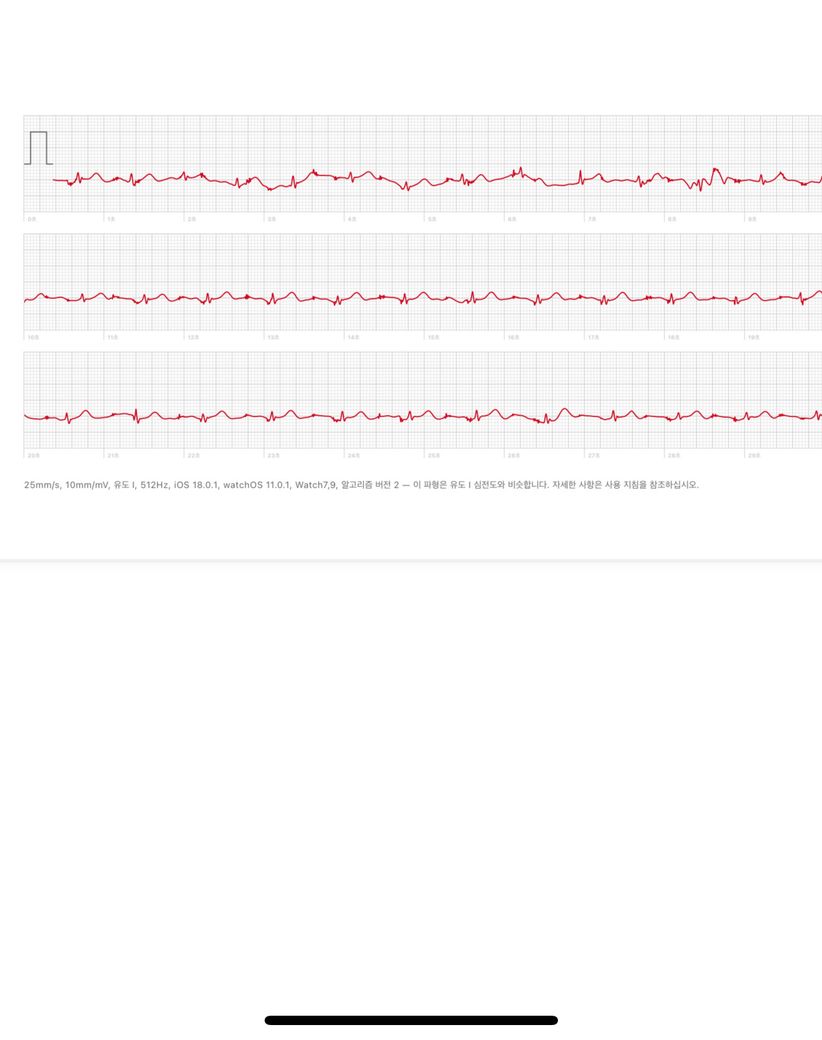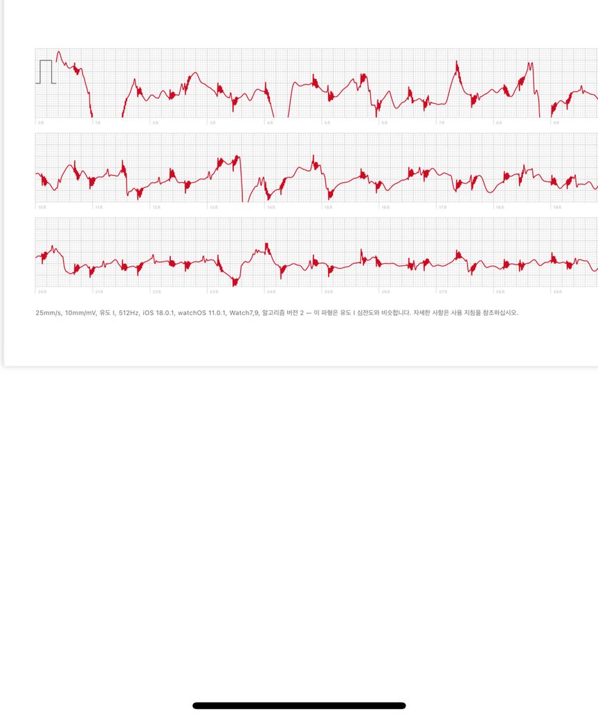 현재 심전도의 파형으로 미루어볼 때 적절한 측정이 제대로 되지 않은 것으로 생각됩니다. 일단 기본 축이 일자로 형성되어 있지 않고 위아래로 움직이면서 측정된 것으로 보아 안정상태에서 촬영하지 않았을 가능성이 있으며 이외에도 기계적인 문제로 인해 파형이 제대로 입력이 안된 상태의 심전도일 가능성이 높습니다.