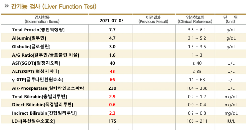 질문하신 내용에 대하여 아래와 같이 답변 드립니다.간 수치는 정상 범위보다 크게 높지 않아 신경 쓸 정도는 아닙니다. 하지만 total bilirubin, 즉 황달 수치가 많이 높은 편으로 간 및 담도 관련하여 정밀 검사가 필요해 보입니다. 소화기내과 진료를 받아보시길 권유드립니다.