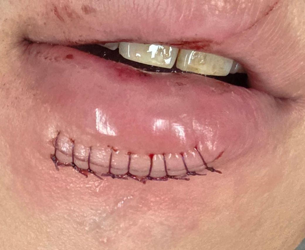 (14일)에 아랫입술 9바늘, 입술 안쪽 5바늘 봉합하고