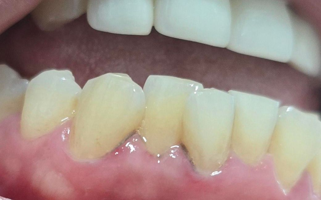 현재 치석 이나 착색이 의심이 됩니다. 치과에 방문하여 스케일링 치료를 받고 치아 및 잇몸 상태를 확인해보길 권합니다.