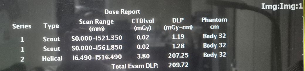 위의 사진에 따른 CT 방사선 유효 선량은 DLP 값을 조직가중의 변환계수를 곱하면 됩니다. 대략적으로 4mSv정도로 추정됩니다.방사선 관련 종사자의 연간 허용량은 최대 50msv입니다.