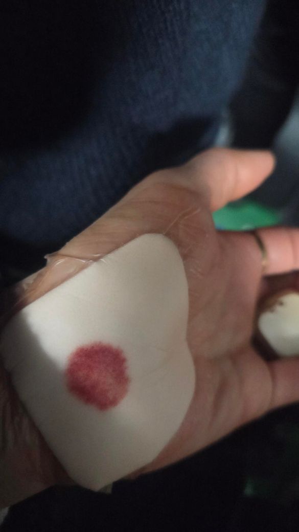 사진상 메디폼 내부에 혈액과 삼출물이 초기 단계로 보이며, 패드가 완전히 포화되지는 않은 상태입니다.