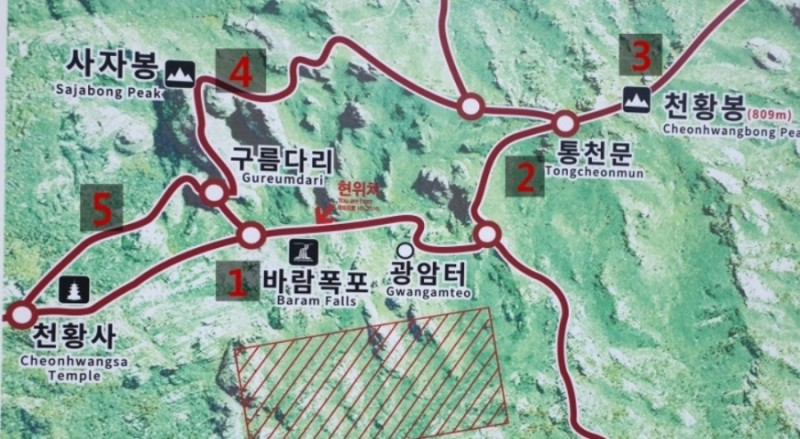 천황사에서 시작해서 천황봉 찍고 천황사로 내려오는 코스는 약 4-5시간 소요되며 전구간 상급코스입니다. 사자봉쪽이 조금더 힘들고 광암터 쪽은 능선입니다.
