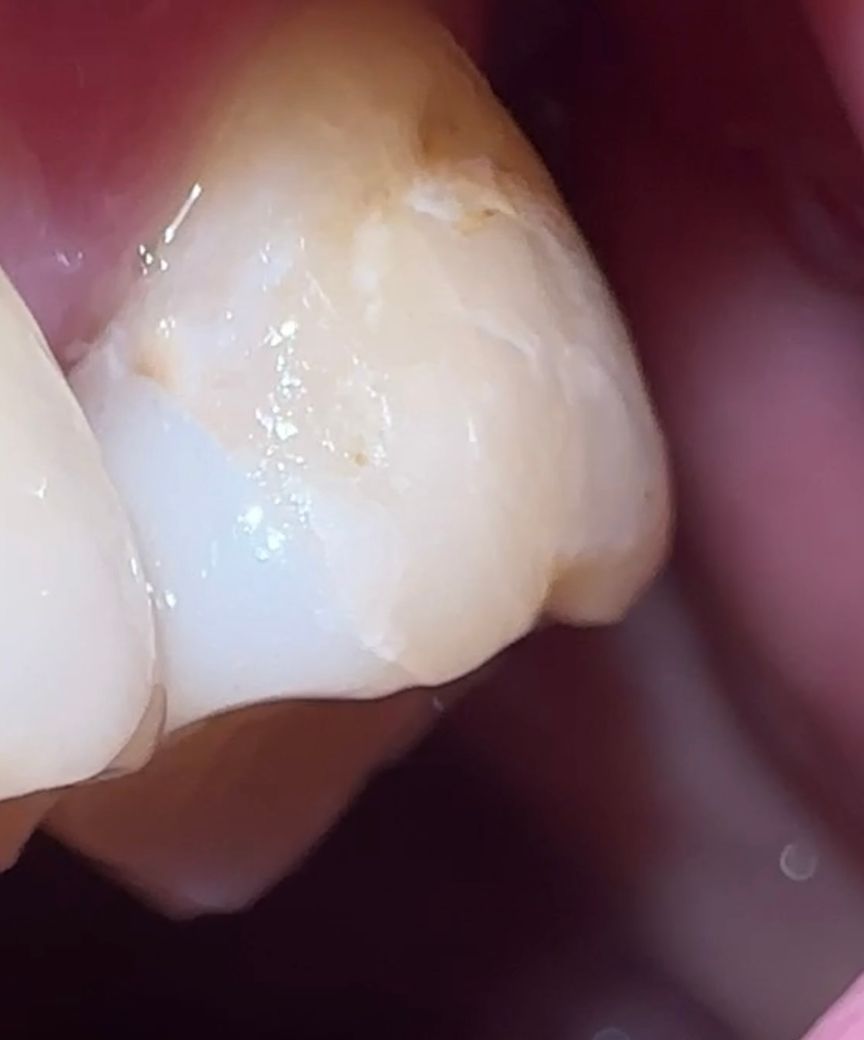 치아 표면에는 원래 잔금이 있을 수 있고 그게 크게 문제가 되진 않습니다. 다만, 딱딱하거나 질긴 음식에 대해 주의할 필요는 있습니다. 아직까지 별다른 증상이 없다면 인레이를 교체하거나, 추가적으로 치아에 크라운을 씌워주거나 그러진 않아도 됩니다.