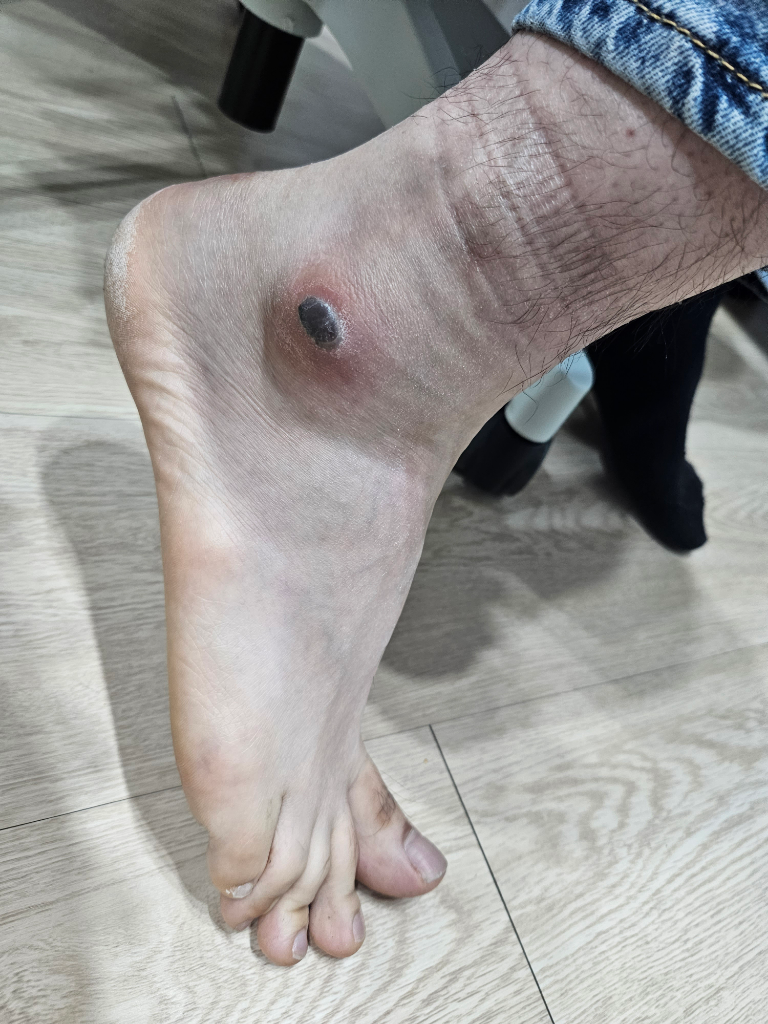 피가 고였다기 보다는 딱지가 생긴 것처럼 보입니다. 주변으로 발적도 동반되는 것으로 보아 염증의 가능성을 고려해보아야 하겠습니다. 관련하여서는 병변 크기도 크기 때문에 혼자서 고민하지 마시고 정형외과나 피부과적으로 진료 및 치료를 적극적으로 받으시길 권고드립니다.