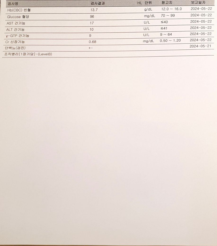 Cr (신장기능): 0.68 mg/dL (정상 범위 0.50-1.20)