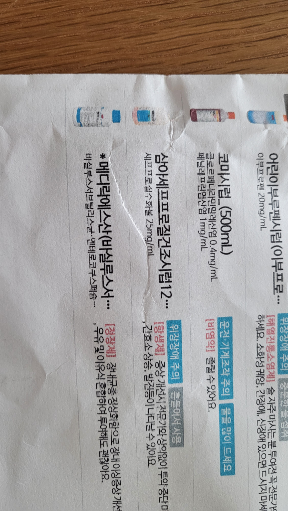 병원에서 처방받은 약 중 부루펜시럽이 들어있기때문에 챔프빨간색과 같이 먹이지마세요.