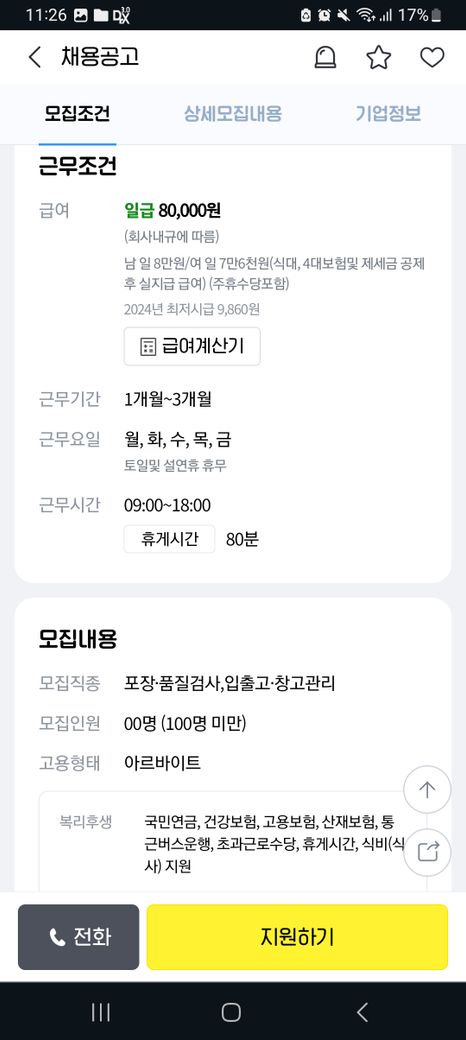 휴게시간 80분 입니다. 4대보험 가입이고요