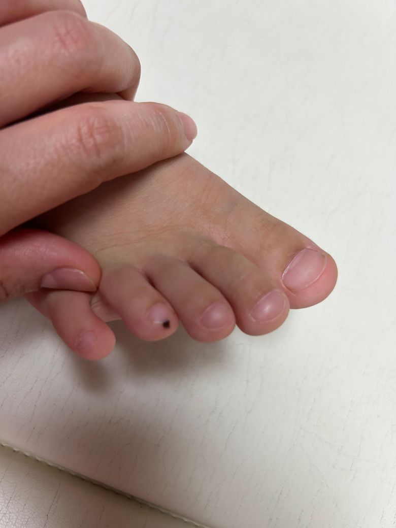 발가락 끝이 충격에 의해 멍이 든것으로 보입니다.