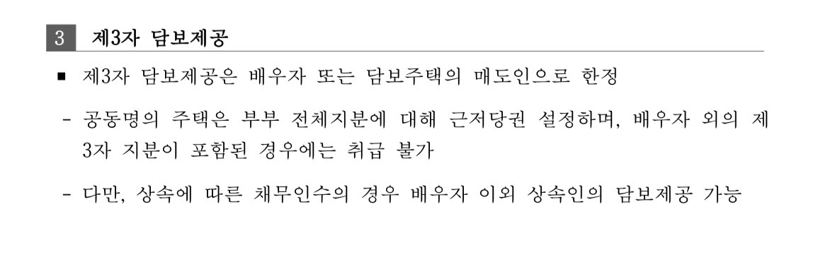 신청인 본인만 채무자가 되고 공동명의자인 상대방이 담보만 제공하는 방식으로 진행되면 원칙적으로 본인의 소득만으로 심사를 받을 수 있습니다. 다만 본인의 소득만으로 대출 한도가 부족할 경우에 한하여 공동명의자인 배우자 등의 소득을 합산하여 심사 받는 것이 가능하며 이때는 합산된 소득만큼 부채도 같이 산정됩니다. 만약 공동명의자가 배우자가 아닌 타인이라면 소득 합산이 불가능할 수 있으므로 반드시 본인 단독 소득으로 DTI 60% 이내를 충족할 수 있는지 먼저 확인해야 합니다. 가장 정확한 방법은 한국주택금융공사 홈페이지나 콜센터를 통해 공동명의자의 관계를 밝히고 본인 소득만으로 진행할 때 담보 제공자의 서류 범위가 어디까지인지 확답받으시는 것입니다. 감사합니다.