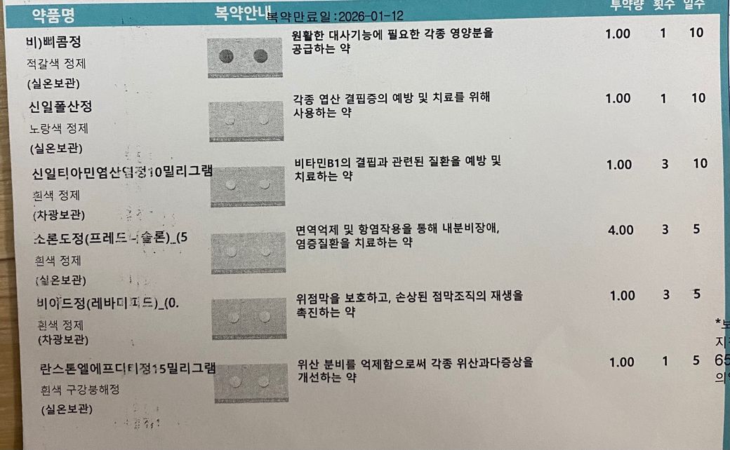 아침(삐콤정1, 신일폴산정1,신일티아민염산염정10mg 1, 란스톤엘에프디티정 15mg 1 + 소로돈정 40mg,비아드정1,신일티아민염산염정10mg 1)
