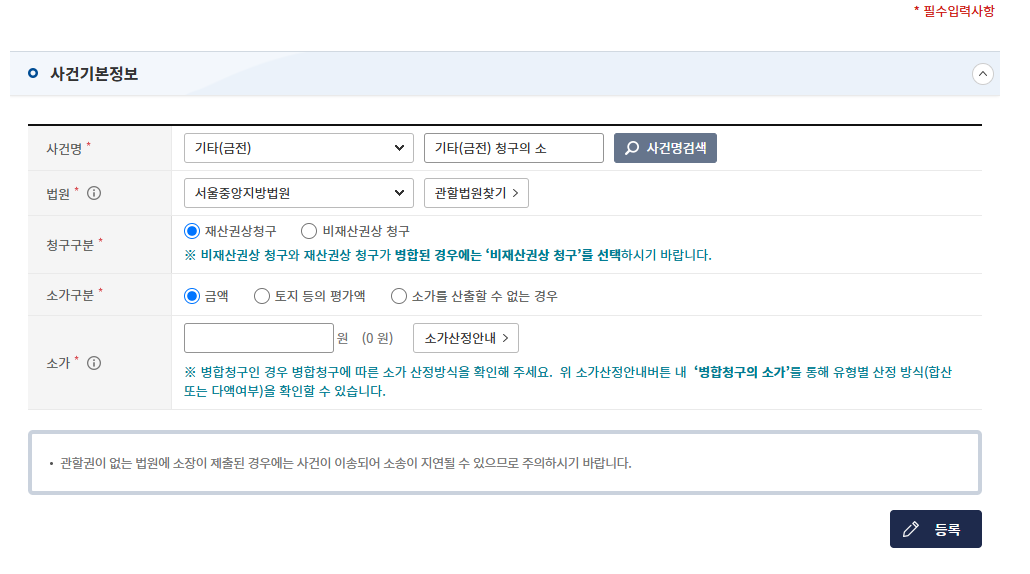 이 내용에서 사건명이 맞는지, 법원은 어디로 지정해야 하는지, 재산권청구랑 비재산권상 청구가 무엇인지 궁금해요!