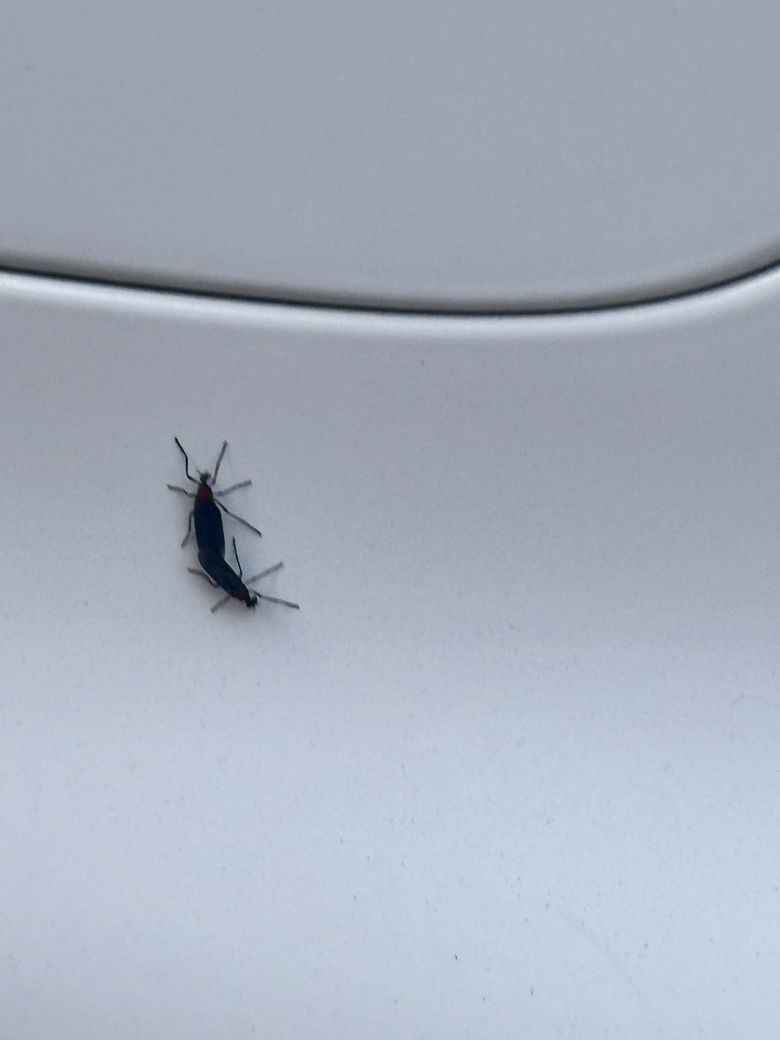 요즘 계단이나 바닥에 많이 보이는 러브버그로 보입니다. 러브버그의 이름은 플레베리아로 주로 봄과 가을에 떼지어 나타나며 짝짓기하는 모습을 자주 볼 수 있습니다. 이 벌레는 미국 남부 미국에서 흔히 볼 수 있는데, 이 벌레들은 검은 몸에 붉은 또는 오렌지색 마킹이 특징입니다. 해충은 아니지만, 미국에서도 갑작스러운 번식으로 인해 차량의 유리등에 많은 피해를 주고 있는 것으로 알고 있습니다. 사진도 차량의 외부가 아닐까 싶습니다.