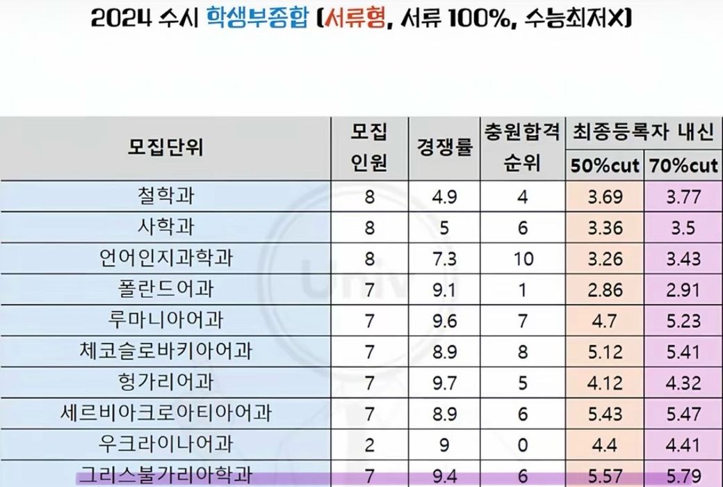 어문계열은 거의 다 외고 출신, 국제고 출신 학생들이 지원하기 때문에 내신등급이 낮게 형성되어있는 것 입니다 일반고(인문계 고등학교)면 저 등급으로는 못갑니다