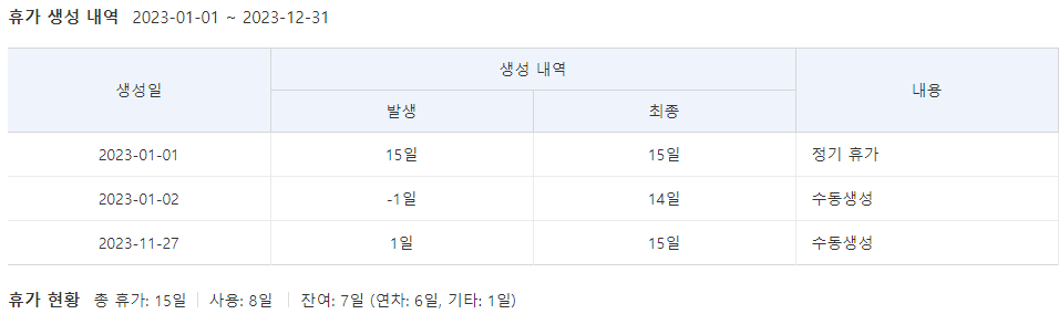 2. 그리고 1년이 지난 23년 1월 24일에 15개의 연차가 발생을 합니다.(연차 한개가 차감되지 않습니다.)