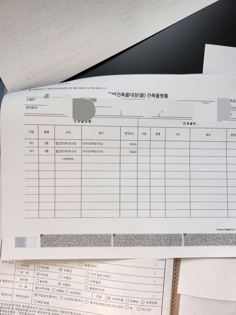 서류상 내용: 건축물대장에는 한 층 전체를 단 1가구가 사용하는 것으로 등록되어 있습니다.