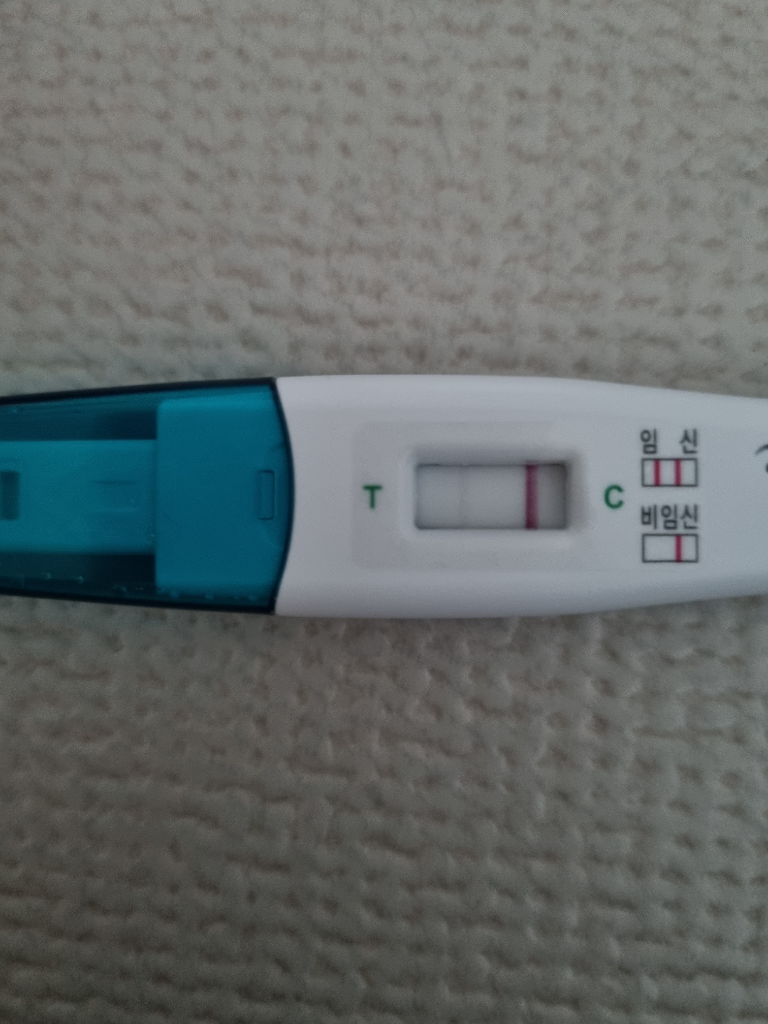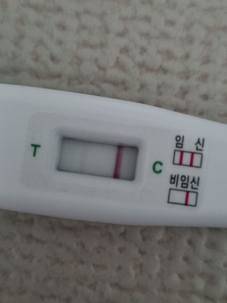 임신테스트기에는 T라고 쓰여있는 테스트에 흐릿하게나마 빨간줄이 보입니다.