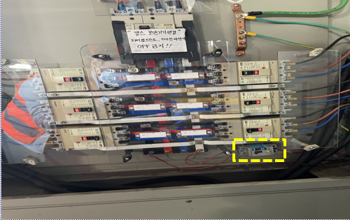 380V를 사용하는 충전기 단자함 내 220V를 사용하는 캡스 시스템?이 있었으나 전압이 다르다는 이유로 인력을 불러 따로 1번 사진에서 2번 사진과 같이 별도의 전압기?를 설치하였습니다.