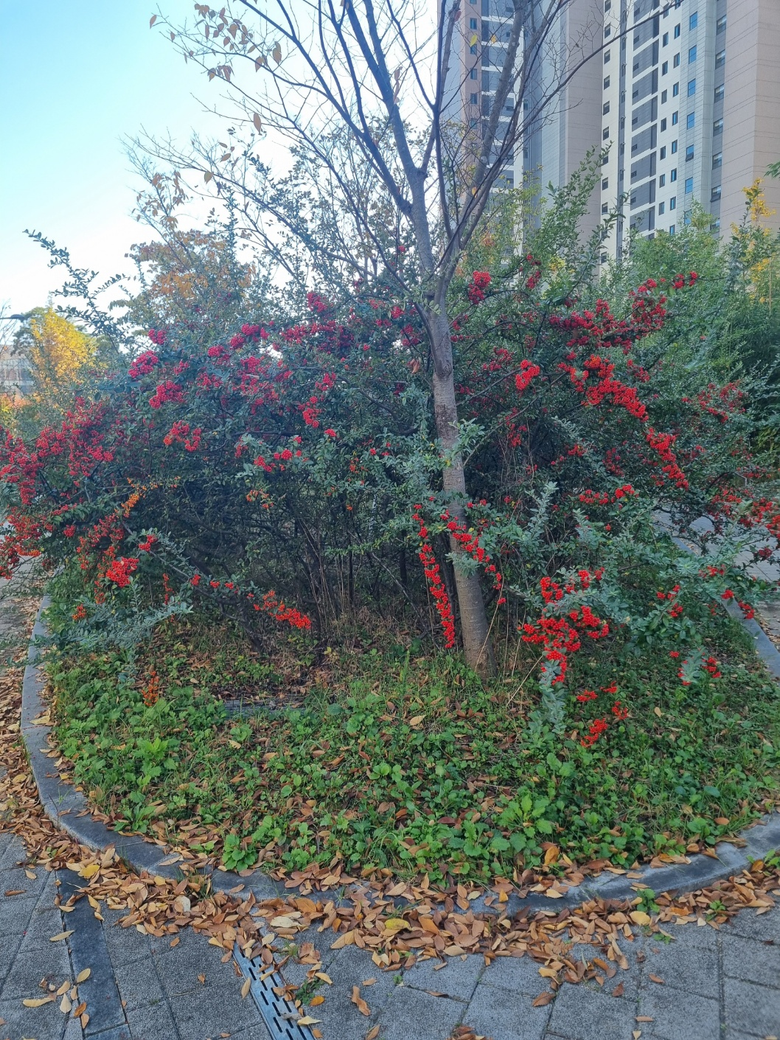 아파트 정원에 심어진 나무입니다. 열매가 맺혔는데 마치 콩알이 많이 뭉쳐있는 것같이 예쁘게 보여, 멀리서 보면 마치 장미꽃과 같습니다. 육각형의 꽃잎이 마치 호랑이 발톱과 같은 모양이라고 해서 호랑가시라고 합니다.