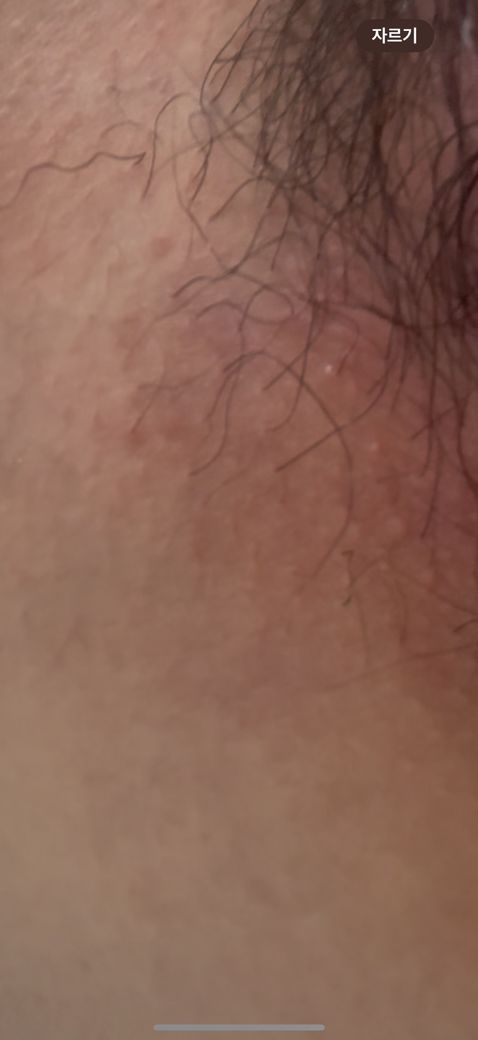 감별로는 접촉성 피부염, 칸디다 간찰진, 초기 사타구니 백선이 있습니다. 다만 사진상 경계가 뚜렷한 원형 홍반이나 중심부 소실은 뚜렷하지 않아 전형적 백선 소견은 아닙니다. 통증이 심하거나 깊은 결절이 반복된다면 화농성 한선염 가능성도 고려하나, 현재 양상은 경미한 표재성 병변에 가깝습니다.