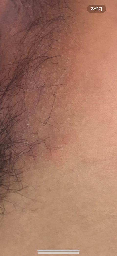 사진과 설명을 종합하면, 외음부와 허벅지 접히는 부위에 반복적으로 발생하는 작은 흰 구진이 터지거나 자극 후 홍반과 각질로 남는 양상입니다. 가장 가능성이 높은 것은 마찰과 습기에 의해 발생하는 모낭염 또는 폐쇄면포(피지 정체)입니다. 해당 부위는 털이 있고 땀과 분비물이 많으며, 속옷과의 지속적 마찰이 있어 모낭이 쉽게 막히고 염증이 반복됩니다. 가렵다가 자극 후 붉어지고, 이후 미세한 인설이 남는 경과도 이에 부합합니다.