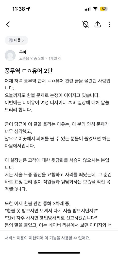 네이버 리뷰는 차단돼서 소비자원에 민원을 넣었고, 이후 당근마켓 동네생활에 후기를 올렸습니다.