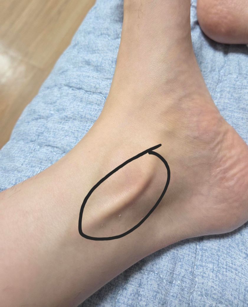 사진상 튀어나와 있는 부위는 후경골건이나 주변 힘줄 돌출 부위일 간으성이 높습니다. 스테로이드 주사는 힘줄 내부에 직접 맞으면 조직 약화, 힘줄 파열, 점액낭염, 피부 위축 등의 부작용이 생길 수 있습니다.