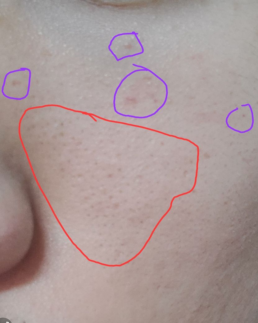 2. 그리고 또 평소엔 이렇게 모공이 넓지 않았는데 빨간줄로 표시한 삼각형 부분들에 모공이 넓어진 것처럼 양쪽 얼굴에 대칭적으로 나와 있고요.