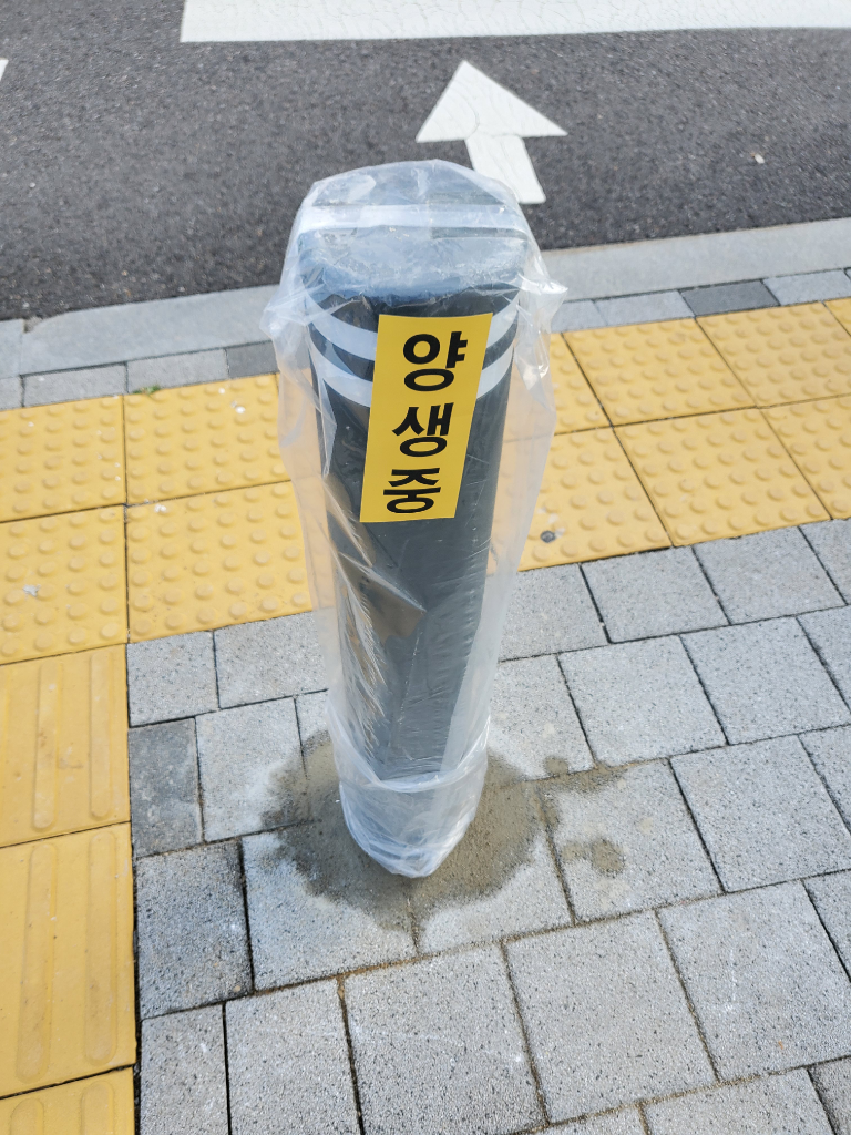 안녕하세요. 조용한참새179입니다.볼라드에 양생중이라는 푯말은 밑에 기붕 시멘틀로 굳게 만들고 있다는 이야기입니다. 햇빛에 3일이면 아주 단단하게 굳어집니다.