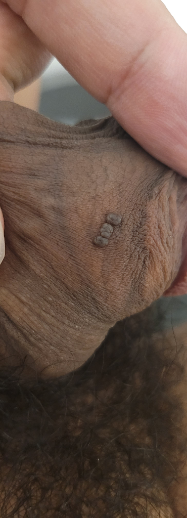 쥐젖이라 부르는 연성 섬유종과 곤지름을 감별해보아야 할 것으로 생각됩니다. 비뇨의학과에서 진료를 받아보시기를 권해드립니다.