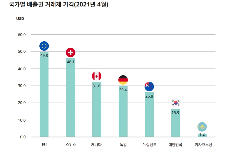 각 국가별로 탄소배출권의 가격은 다소 차이가 있습니다.