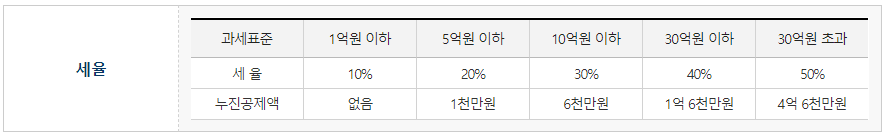 증여재산공제 초과금액은 아래의 세율로 증여세가 부과됩니다.