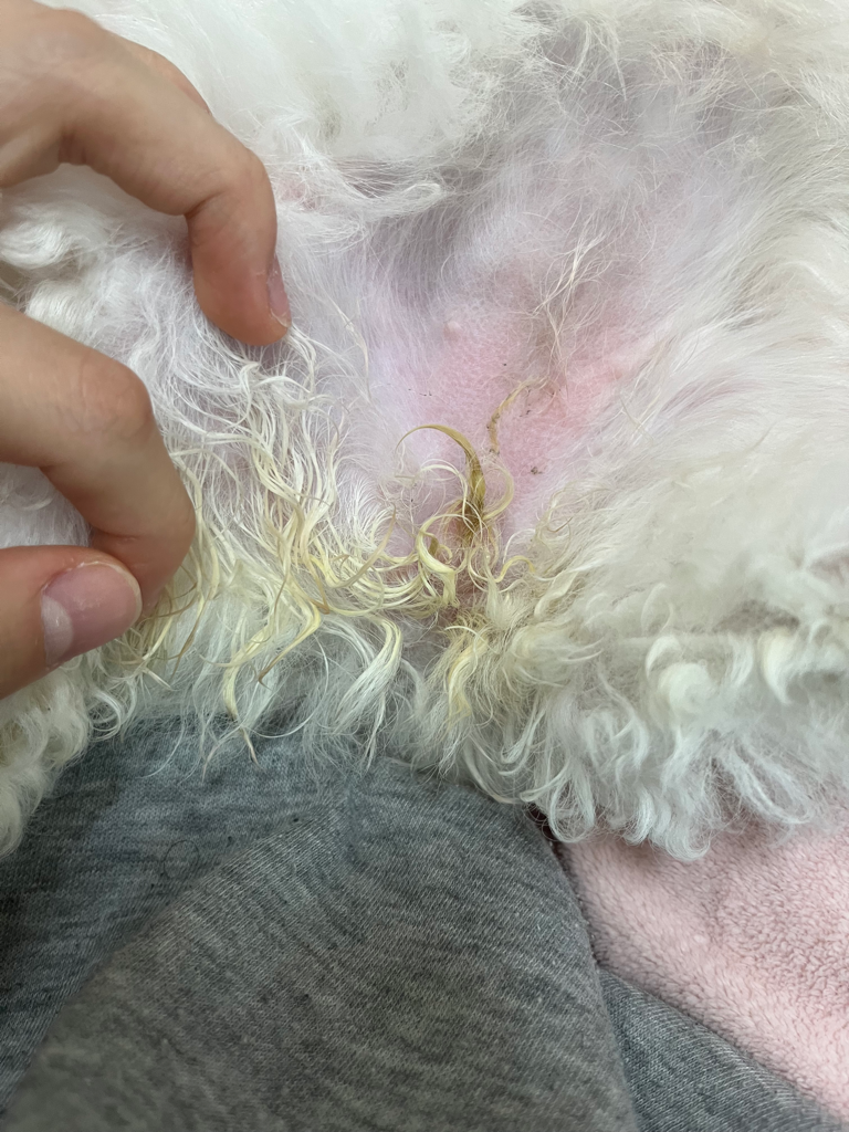 강아지가 오줌싸고 털이 엉겨붙고 굳었는데 어떻게 해야하나요ㅜ 물티슈로는 잘 안되네요 아직 애기라서 샤워는 안된대요...ㅜㅜ