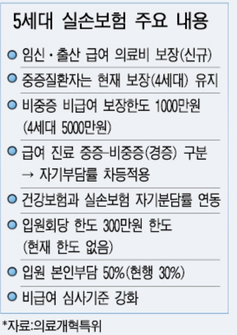 5세대의 가장 큰 특징은 비급여 진료에 대해서 중증과 비중증으로 나뉘는데 보장의 한도가 축소되고 비중증에 대해서는 자기부담금이 50%올라가는데에 있습니다.