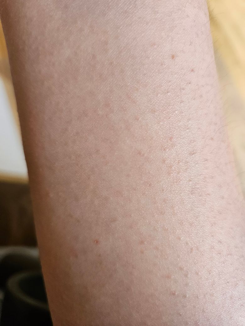 정확한 진단은 직접 육안으로 보고 촉진도 해보아야 가능합니다만 현재는 그냥 모공이 두드러져보이거나 모공각화증이 약하게 있는 정도 같습니다.