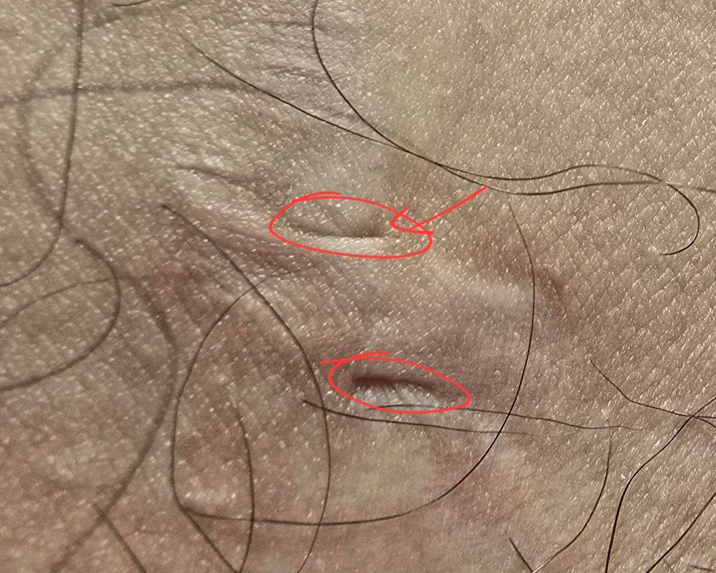 이렇게 두 줄이 남았고 화살표 친쪽 끝에서 진물이 나옵니다 색소침착은 반대쪽에 비해선 덜한 거 같고요