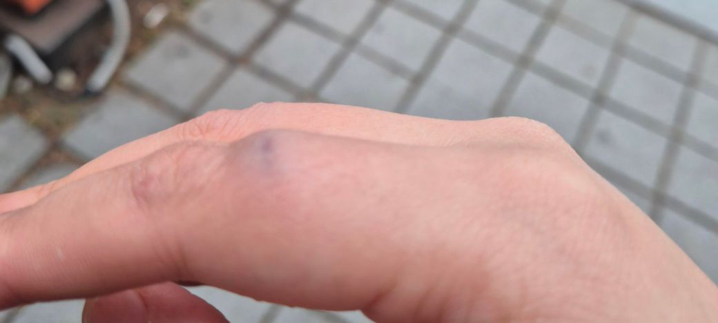 사진상으로는 정확한 상태를 확인하기는 어려우나, 손가락이 문틈 사이에 끼어서 멍이 들고 부풀어 오른 상황은 타박상이나 연부조직 손상을 의심해 볼 수 있을 것 같습니다.