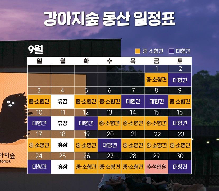 ⭐️강아지동산은 따로 일정표가 인스타에 공지되어있으니깐 참고하시고 가시면 좋을거같아요! (중소형견,대형견 만 가능한 날도있고 휴장일때도 있어서 월마다 올라오는 일정표 확인하셔야해요) @d.forest_park