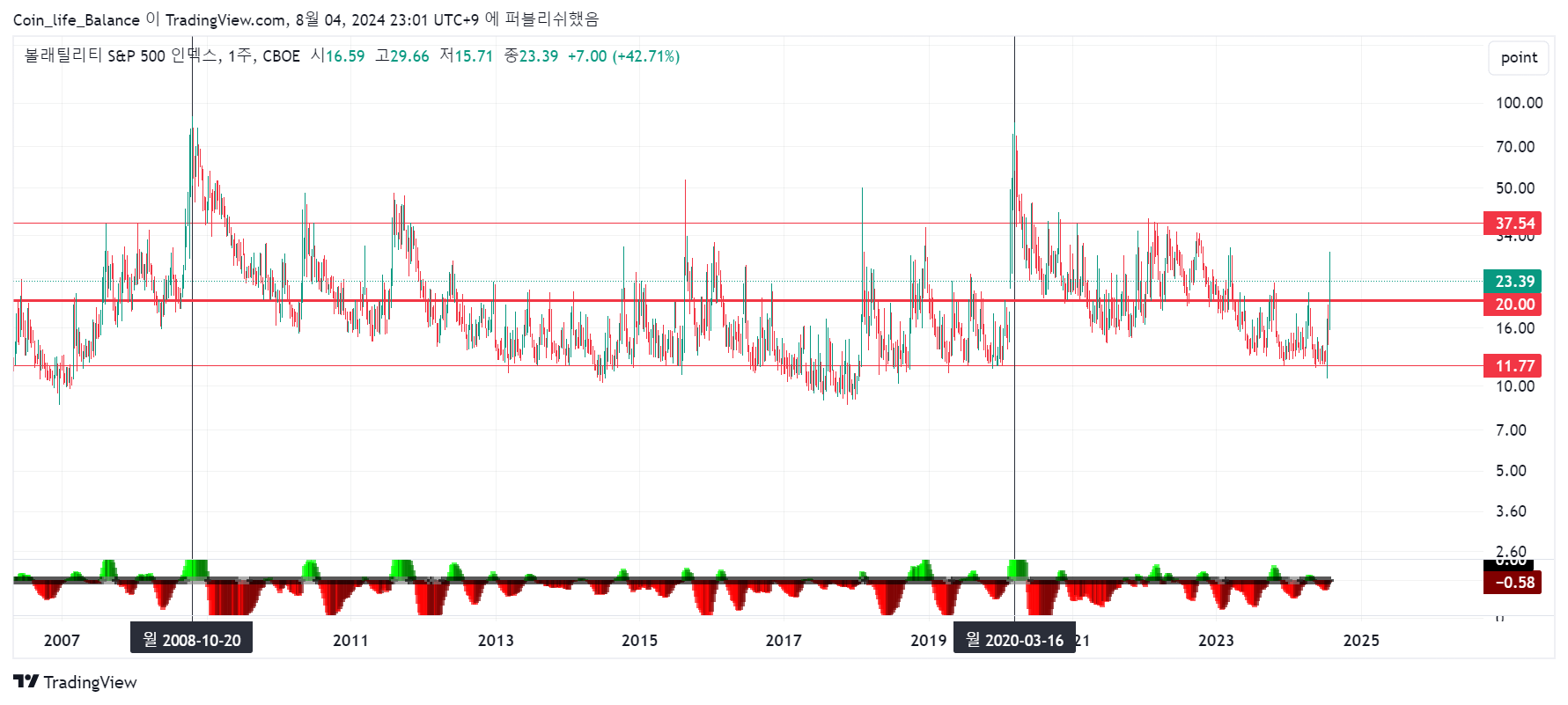 실제로 전통금융시장의 "공포지수"를 보여주는 VIX지수의 경우 20을 기준으로 이보다 높으면 시장이 매우 불안해 한다고 생각하는데 최근에 20을 돌파하여 매우 가파르게 상승 하였습니다.
