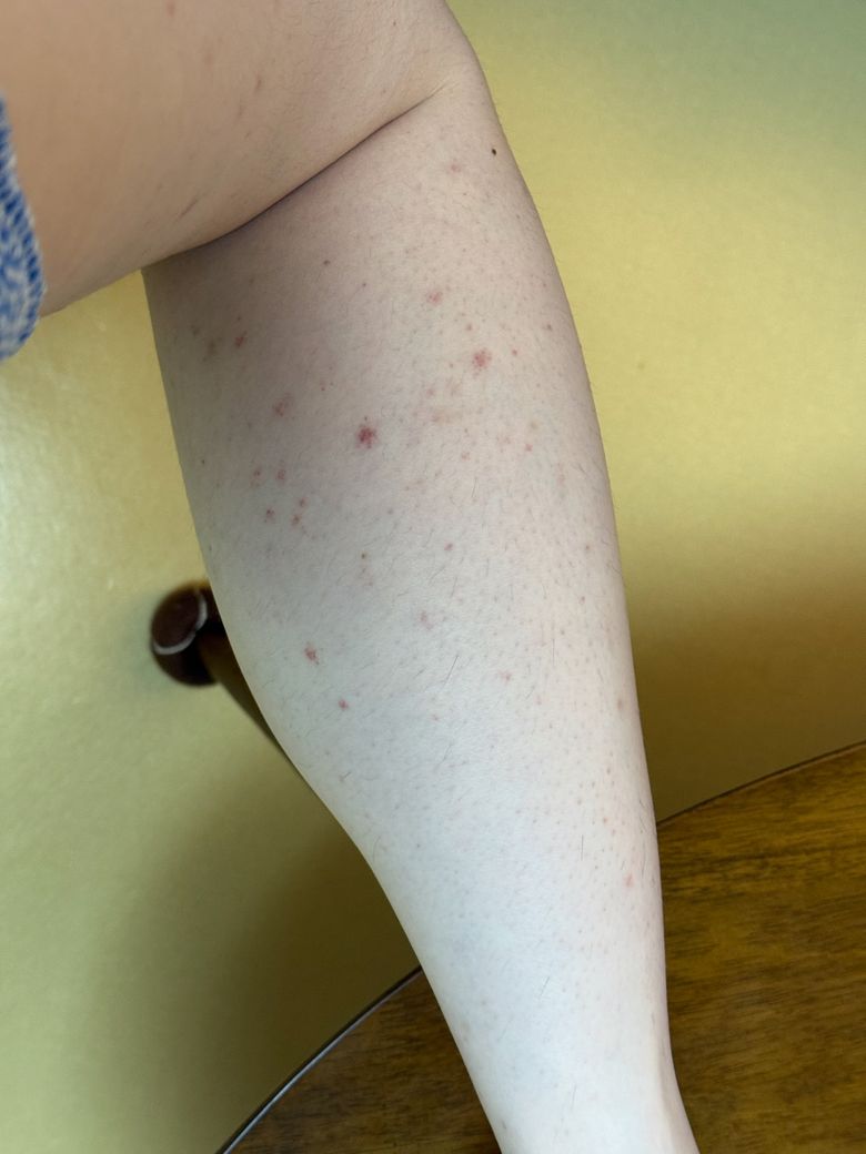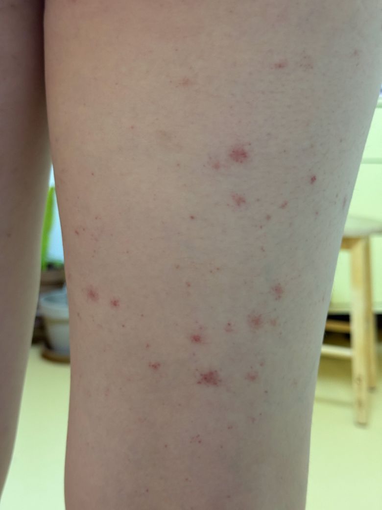 근데 오늘 아침까지 괜찮다가 저녁에 보니 다리 전체에 다 퍼졌어요. (반바지 착용) 복부 쪽은 옷에 스쳐 조금 간지럽긴 한데 나머진 간지럽지도, 오돌토돌하지도 않아요.