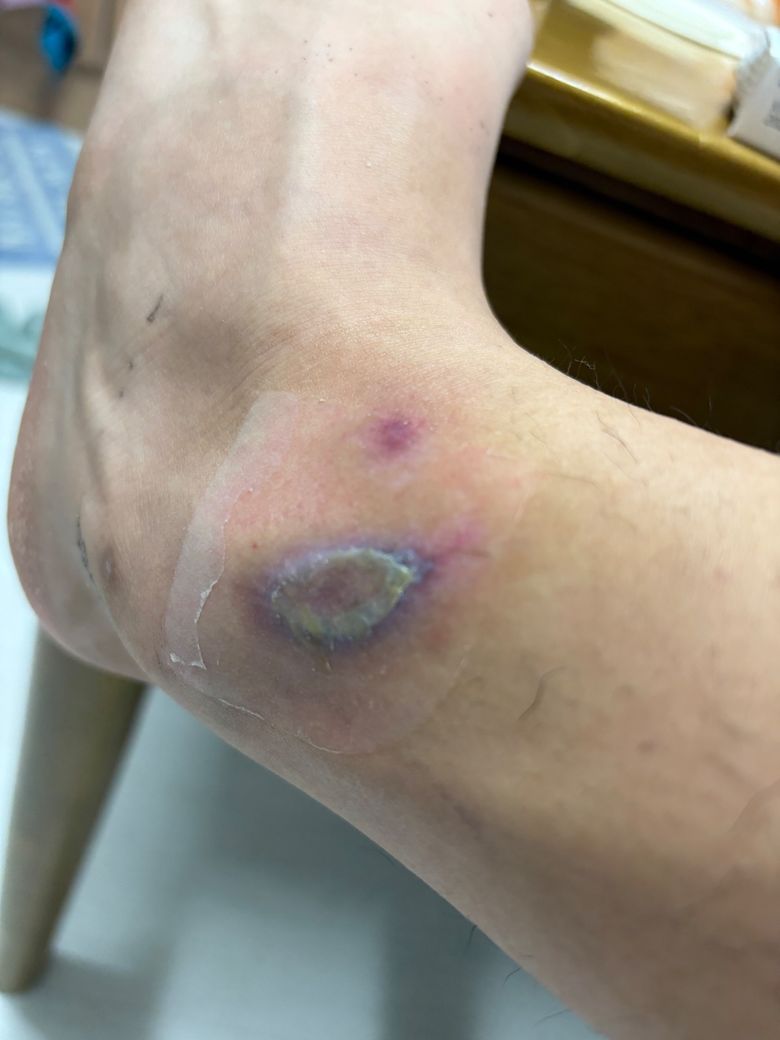 상처 부위 연고나 소독제 없이 메디폼 계속 셀프로 갈아줬는데 저번주 목요일 부터 점점 발목 상처 주위가 보라색이 됩니다 괜찮을까요?