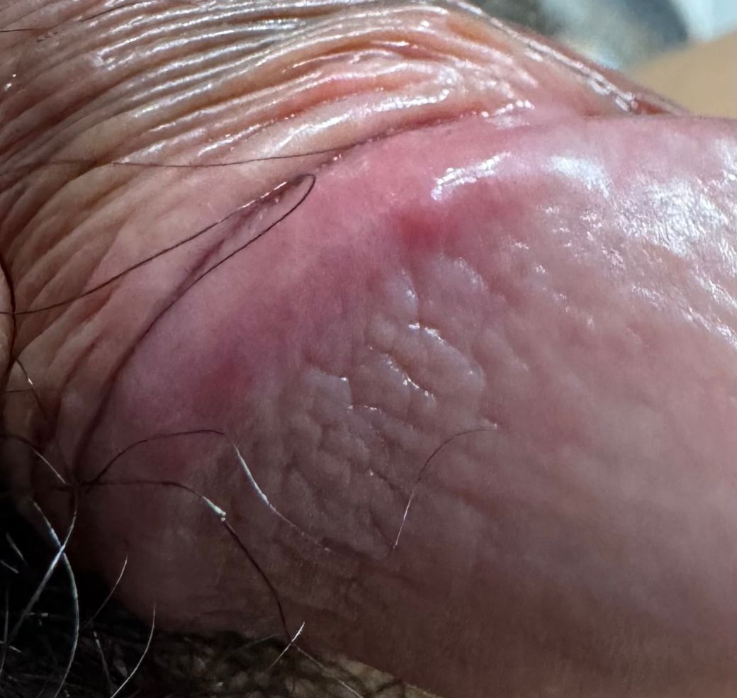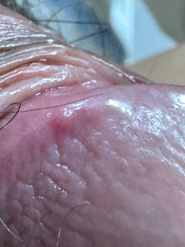 귀두 테두리(?)부분에 붉은 반점이 있습니다. 실제 병변은 1mm도 안되게 작은 사이즈이며, 성관계는 약 10일전이 마지막입니다.